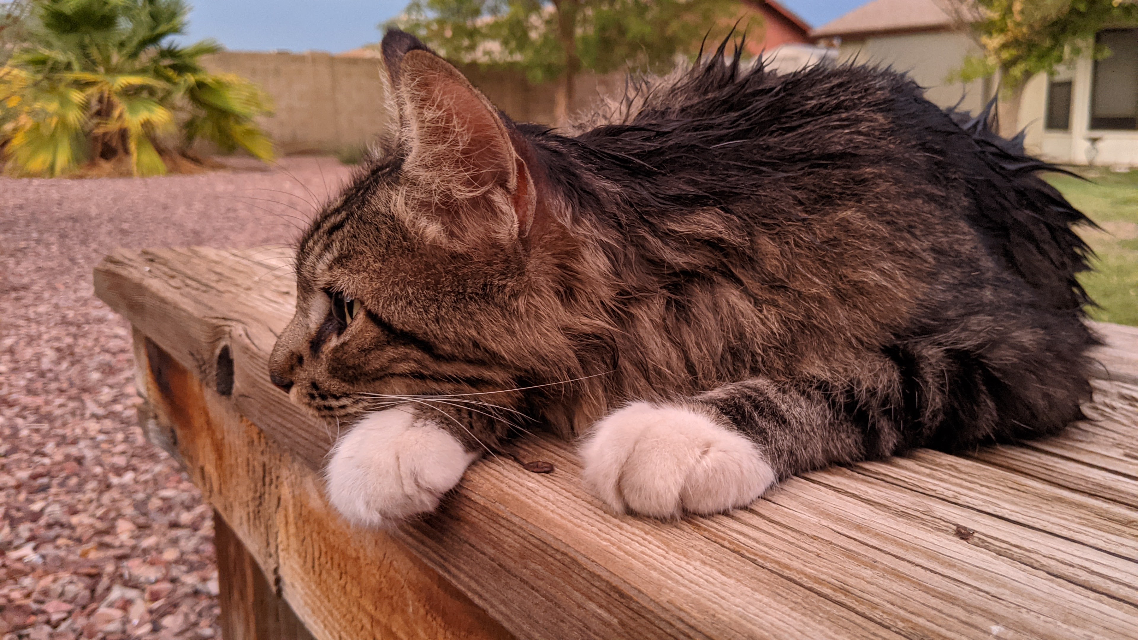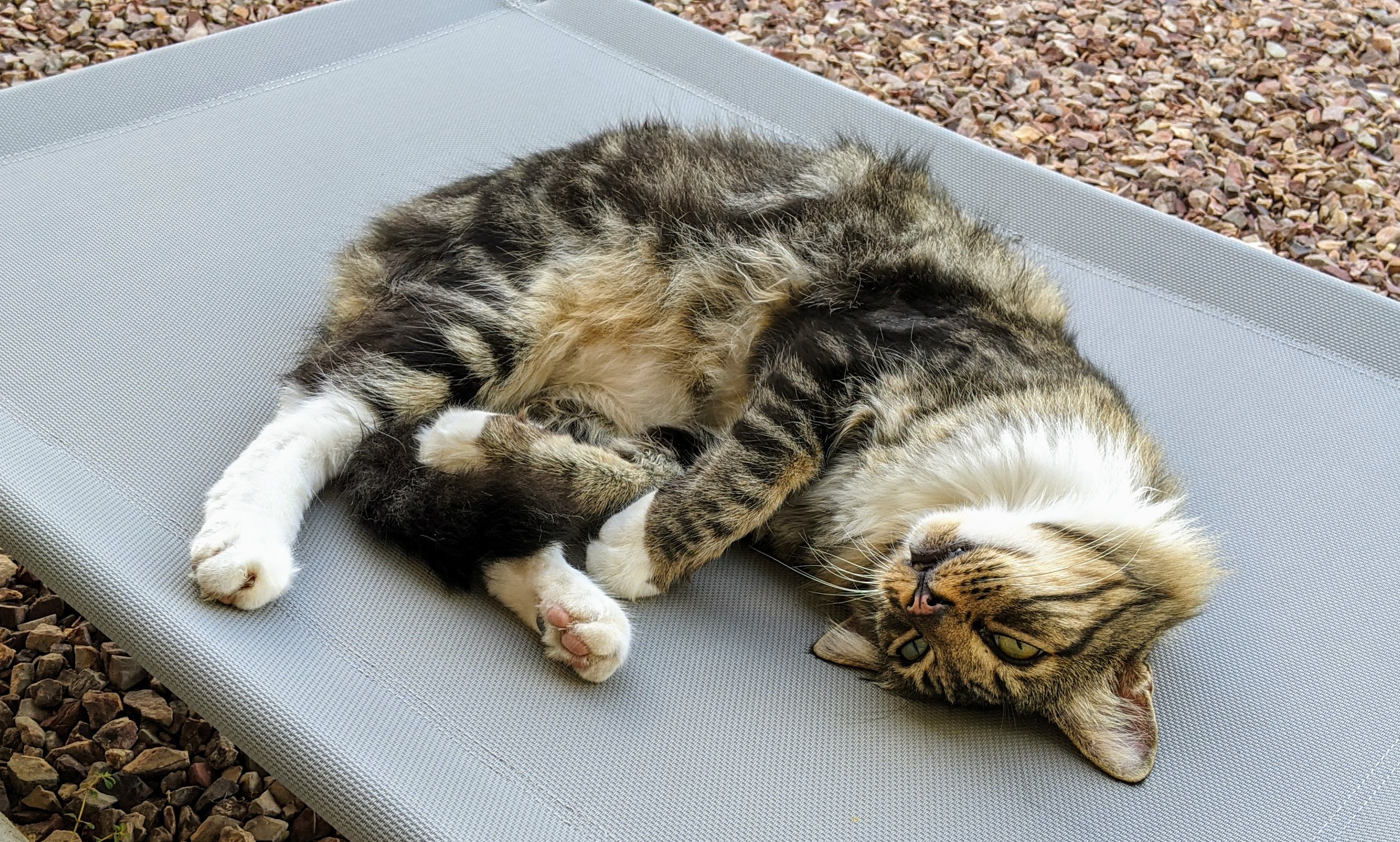 Sweetie is still not an indoor cat. Not even close. I’ve learned to be more clear about my intention when I bring him in so that I’m not giving him mixed messages, but we’ve still only worked our way up to 40 minutes at a time — once. And the real deal breaker is that he doesn’t seem inclined to use a litter box; turns out, he’s a sprayer! Ugh. Perhaps this is why he is outside in the first place. This may be a bigger challenge than I can overcome. He’s a cat that has learned to live outside. So, I love him where he is by feeding him plenty of good food, giving him comfortable places to rest, cool baths in the heat of the day, and lots of affection. My indoor cats are getting used to seeing him in the yard. Time will tell if they learn to co-exist. As a friend says, even if he’s still outside, Sweetie’s life has greatly improved. To that I would add, so has mine.