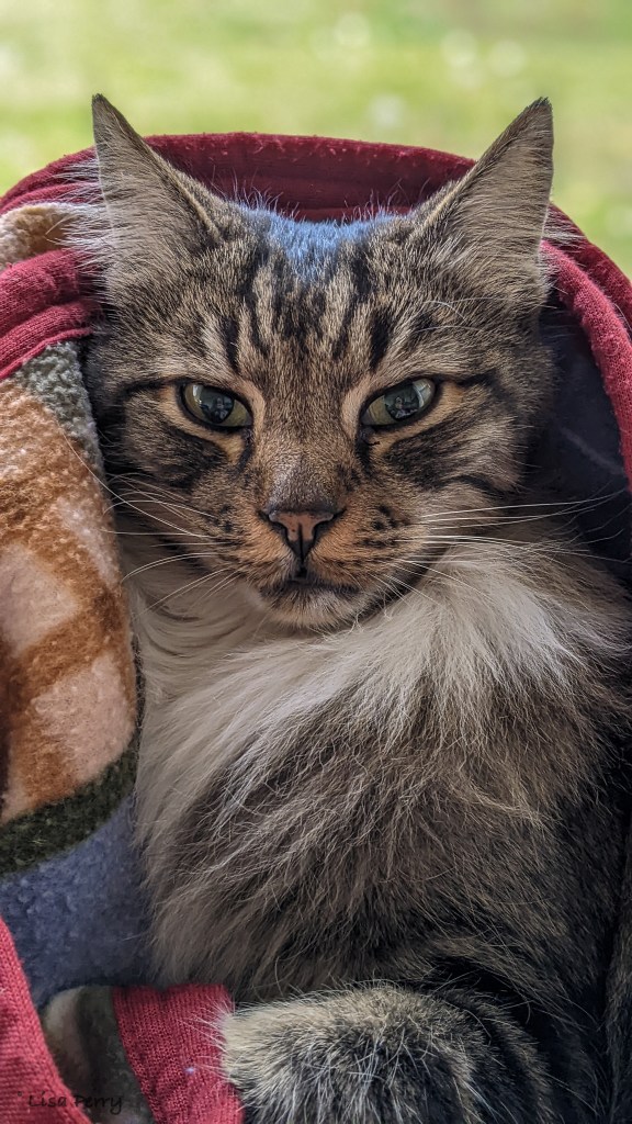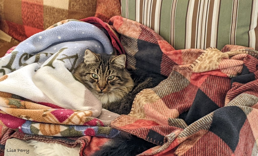 On these cold mornings after I feed him, our routine includes long cuddles while he snoozes in my lap. I drink coffee and meditate on the morning light, happy to have him stay in my lap as long as he will tolerate it. So far, his limit is just over an hour and a half. For me, this is the pay off for caring for this cat.